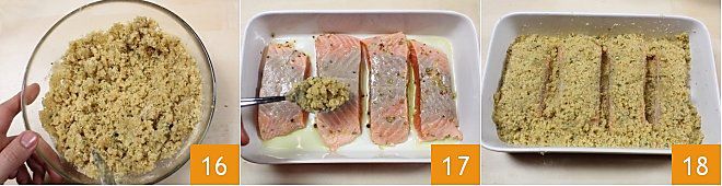 und mischen Sie gut, um die Panade feucht zu machen 16. Bedecken Sie die gesamte Oberfläche des marinierten Lachses mit der feuchten Panade (17-18). Backen Sie den marinierten Lachs im vorgeheizten statischen Ofen bei 180° für 10 Minuten (oder im Umluftofen bei 160° für 6-7 Minuten). Nach 10 Minuten ändern Sie die Ofenfunktion von statisch auf Grill, erhöhen Sie die Temperatur auf 230° und gratinieren Sie den marinierten Lachs für weitere 5 Minuten. Wenn die Panade gut gebräunt ist, nehmen Sie den marinierten Lachs aus dem Ofen und lassen Sie ihn einige Minuten abkühlen, bevor Sie ihn servieren.