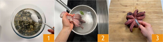 Um den maritimen Reissalat zuzubereiten, beginnen Sie damit, den Fisch zu reinigen. Zuerst kümmern Sie sich um die Reinigung der Venusmuscheln, lassen Sie sie ein paar Stunden in frischem Wasser und Salz auslaugen 1; spülen Sie sie ab und stellen Sie sicher, dass keine leeren, kaputten oder sandgefüllten Schalen vorhanden sind, andernfalls verwerfen Sie diese. Bringen Sie einen Topf mit Wasser zum Kochen, fügen Sie ein Lorbeerblatt hinzu und kochen Sie den Oktopus für 20-25 Minuten 2; testen Sie den Gargrad, indem Sie ihn mit einer Gabel einstechen. Lassen Sie ihn am Ende abkühlen, entfernen Sie dann den Schnabel 3 und die Augen.