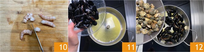 Entfernen Sie den Darm und schneiden Sie auch hier in Stücke gleicher Größe 10. In einem großen Topf erhitzen Sie etwas Öl und eine Knoblauchzehe, fügen Sie dann die Muscheln 11 und die Venusmuscheln 12 hinzu.