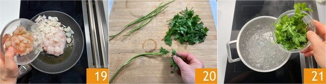 Fügen Sie auch die Garnelen hinzu 19 und braten Sie sie bei starker Hitze ein paar Minuten lang unter gutem Schütteln der Pfanne, bis der Garboden getrocknet ist. Zu diesem Zeitpunkt haben Sie alle Fische gekocht. Kümmern Sie sich um das Petersilienöl: Trennen Sie die Blätter der Petersilie von den Stielen 20 und blanchieren Sie sie 1 Minute in kochendem Wasser 21.