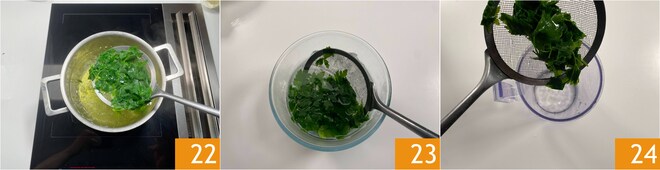 Dann abtropfen lassen 22, darauf achten, das Kochwasser aufzubewahren, und in eine Schüssel mit Eiswasser geben 23. Wenn sie abgekühlt sind, geben Sie sie in den Behälter eines Mixers 24.