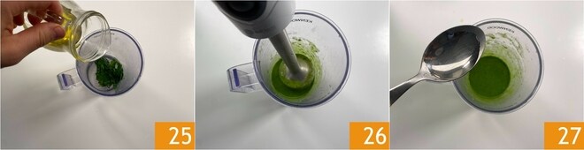 Gießen Sie das Öl 25 ein und pürieren Sie es mit dem Stabmixer 26; wenn Sie sehen, dass die Mischung zu trocken ist, können Sie 2-3 Esslöffel Eiswasser hinzufügen 27.