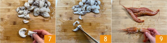Kümmern Sie sich dann um die Wie man Tintenfische säubert, indem Sie das Innere entfernen 7, dann den Mantel in Stücke von 1,5 cm zerkleinern, nachdem Sie ihn von den Tentakeln getrennt haben 8. Reinigen Sie die Garnelen, indem Sie den Kopf 9, den Panzer und den Schwanz entfernen.