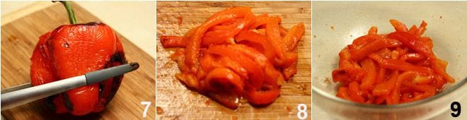 Rösten Sie dann die beiden Paprikaschoten im Ofen, bis sie weich sind 7, machen Sie sich keine Sorgen, wenn die äußere Haut leicht brennt. Schälen Sie die gerösteten Paprika und schneiden Sie sie in etwa einen Zentimeter breite und 5 Zentimeter lange Streifen 8. Legen Sie die Streifen in eine Schüssel, salzen Sie leicht und lassen Sie sie 30 Minuten ruhen 9. Dieser Vorgang entzieht den Paprika überschüssiges Wasser, das für die Zubereitung des Dressings aufgefangen werden muss.