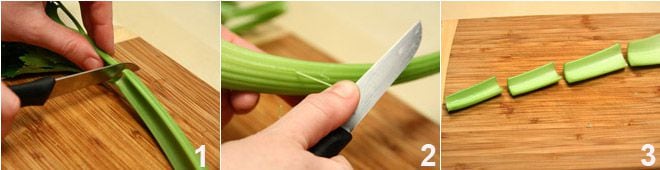 Trennen Sie die Selleriestangen von den Blättern 1, entfernen Sie die faserigen Teile 2 und schneiden Sie sie in etwa 5 Zentimeter lange Stücke 3