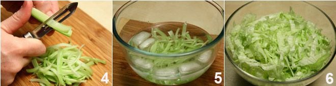 aus denen Sie mit einem Sparschäler Streifen entlang der langen Seite ziehen 4. Tauchen Sie diese schließlich in Eiswasser, um sie knackig zu machen 5. Ziehen Sie ähnliche Streifen aus dem zuvor gewaschenen und getrockneten Eisbergsalat und geben Sie sie in eine Schüssel 6; waschen Sie die Sellerieblätter gut und hacken Sie sie fein, wie Petersilie.