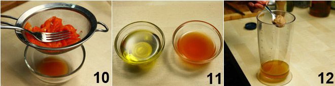 Beginnen Sie dann mit der Zubereitung des Dressings, indem Sie das Wasser der Paprika mit einem Sieb auffangen 10. Geben Sie es in einen Mixer und fügen Sie die gleiche Menge Öl und weißen Weinessig hinzu 11. Fügen Sie auch die zwei Teelöffel Senf und den Teelöffel Honig hinzu und emulgieren Sie alles gut 12, fügen Sie etwas lauwarmes Wasser hinzu, wenn die Konsistenz zu cremig wird. Schließlich mit Salz und Pfeffer abschmecken.