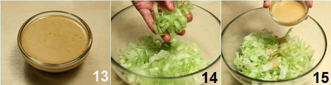 Gießen Sie das Dressing in eine Schale und stellen Sie es beiseite 13. Mischen Sie in einer Salatschüssel die Streifen aus Eisbergsalat und Sellerie 14, würzen Sie mit einem Teil des Dressings und mischen Sie gut 15.