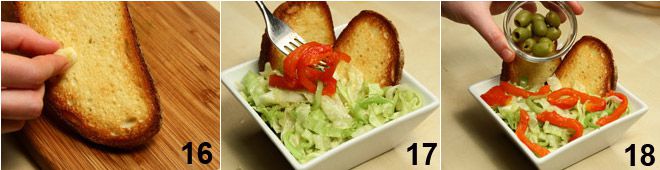 Bestreichen Sie schließlich die 8 Brotscheiben mit etwas Öl und rösten Sie sie im Ofen. Wenn das Brot gut geröstet ist, reiben Sie die Knoblauchzehe leicht auf die Scheiben, die den Salat begleiten werden 16. Richten Sie den Salat an und fügen Sie die Paprikastreifen hinzu 17,