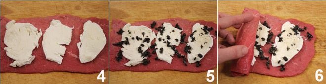 Legen Sie auf jede Fleischscheibe 2/3 gut abgetropfte Mozzarellascheiben 4, verteilen Sie die gehackten Oliven 5 und rollen Sie das Fleisch von der kürzeren Seite her auf, wie ein Roulade 6.