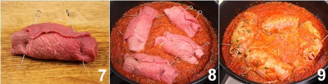 Schließen Sie diese gut mit zwei Zahnstochern 7. Legen Sie die Rouladen in die Sauce 8, salzen Sie sie auf beiden Seiten, decken Sie sie mit einem Deckel ab und lassen Sie sie bei sehr niedriger Hitze (die Sauce sollte leicht köcheln) etwa 20 Minuten kochen. Am Ende der Garzeit 9 mit Salz abschmecken. Sollte der Mozzarella während des Kochens Wasser verloren haben, holen Sie die Rouladen aus der Pfanne, halten Sie sie warm und lassen Sie die Sauce leicht eindicken! Servieren Sie die Rouladen heiß, begleitet von Kartoffelpüree oder gekochtem Reis!