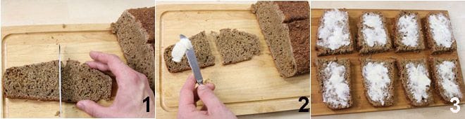 Um die irischen Bruschettas zuzubereiten, nehmen Sie das Schwarzbrot mit Getreide und schneiden Sie es in Scheiben von etwa 1 cm Dicke; legen Sie sie auf das Schneidebrett, schneiden Sie sie in Hälften 1 und bestreichen Sie sie mit einer Schicht Butter (etwa 5 g) mit Hilfe eines Messers 2. Wiederholen Sie den Vorgang für alle Brotscheiben 3.