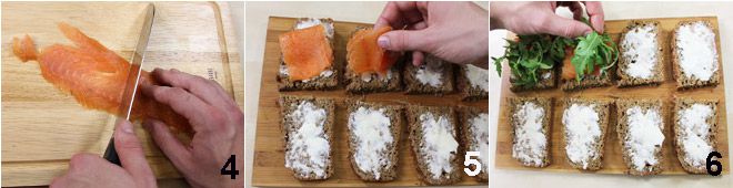 Danach nehmen Sie den Lachs und schneiden ihn in Scheiben: Jede Scheibe sollte etwa 30 g wiegen und die gleiche Größe wie die Brotscheibe haben 4. Legen Sie dann jede Lachsscheibe auf das Brot 5 und fügen Sie auf jedes Bruschetta ein paar Rucolablätter hinzu (ungefähr 4 g pro Scheibe) 6.