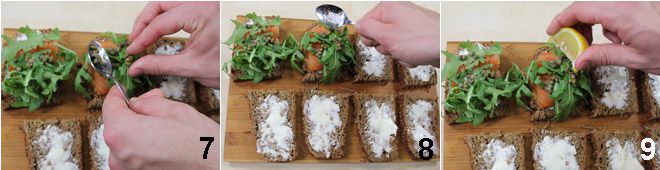 Auf jede Scheibe geben Sie einen Teelöffel Kapern (etwa 4 g) 7, würzen Sie schließlich mit einer Prise grobem Salz 8 und einem Spritzer Zitrone 9. So, Ihre irischen Bruschettas sind bereit, genossen zu werden!
