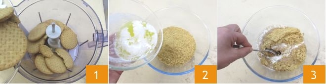 Um den Joghurtkuchen mit Erdbeergelee und Waldbeeren zuzubereiten, beginnen Sie damit, die Kekse in den Mixer zu geben 1 und die Klingen zu betätigen, um sie zu Pulver zu verarbeiten. Übertragen Sie das Keksmehl in eine Schüssel und fügen Sie die Butter hinzu, die Sie in einem Topf geschmolzen haben 2. Gut vermengen 3, um eine homogene Masse zu erhalten.