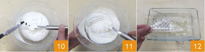 Fügen Sie die Vanillesamen zur cremigen Mischung hinzu 10 und vermischen Sie weiter, bis sie homogen ist 11. Legen Sie in der Zwischenzeit die Gelatine für etwa 10 Minuten in kaltes Wasser 12.