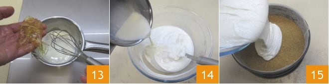Erhitzen Sie die Sahne in einem Topf und drücken Sie nach der Einweichzeit die inzwischen weiche Gelatine aus und fügen Sie sie der heißen Sahne hinzu 13, rühren Sie, bis sie sich vollständig aufgelöst hat. Fügen Sie die Flüssigkeit der Joghurtcrememischung hinzu 14, mischen Sie sorgfältig, um sie gleichmäßig zu integrieren, und nehmen Sie dann die Springform aus dem Gefrierschrank und gießen Sie die Mischung auf die Keksbasis 15, glätten Sie sie vorsichtig.