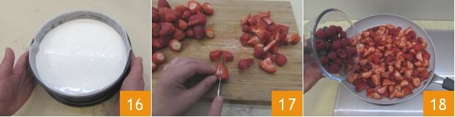 Stellen Sie sie für mindestens 2 Stunden in den Kühlschrank, damit sie fest wird 16. In der Zwischenzeit kümmern Sie sich um das Gelee für die Abdeckung. Reinigen und waschen Sie die Erdbeeren und schneiden Sie sie in Hälften 17. Geben Sie sie zusammen mit den Himbeeren in eine große Pfanne 18