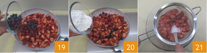 Und den Heidelbeeren 19, und fügen Sie auch den Puderzucker hinzu 20. Rühren Sie um und lassen Sie es mindestens 10 Minuten bei schwacher Hitze kochen, dann passieren Sie das erhaltene Püree durch ein Sieb 21.