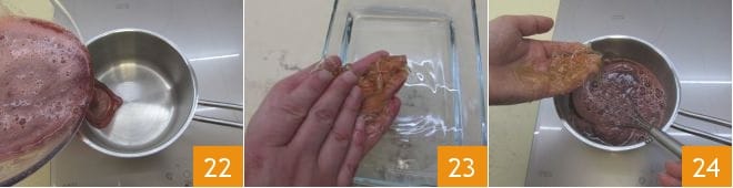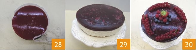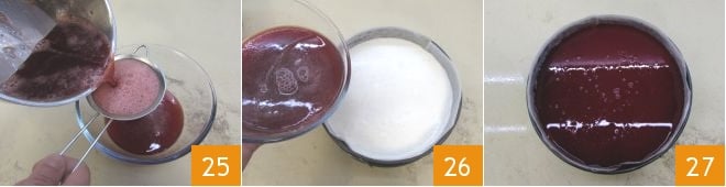Filtern Sie die Mischung 25 und lassen Sie sie abkühlen, dann gießen Sie sie in die Springform über die inzwischen fest gewordene Joghurtcremeschicht 26. Glätten Sie sie gut und stellen Sie sie in den Kühlschrank, wo der Kuchen weitere 2 Stunden fest werden muss 27.