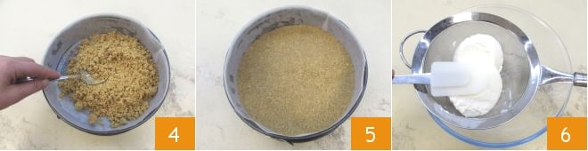 Legen Sie eine Springform mit einem Durchmesser von 22 cm mit Backpapier aus und verteilen Sie die Mischung auf dem Boden 4, indem Sie mit der Rückseite eines Löffels drücken, um eine kompakte und glatte Basis zu erhalten 5. Stellen Sie sie für mindestens eine halbe Stunde in den Gefrierschrank, damit die Masse fest wird. In der Zwischenzeit widmen Sie sich der Creme: Sieben Sie den Ricotta in eine Schüssel 6, um die Molke zu entfernen.