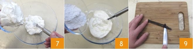 Fügen Sie den griechischen Joghurt hinzu 7 und beginnen Sie mit einem Spatel oder Schneebesen, zu vermischen. Fügen Sie den Puderzucker hinzu 8, nehmen Sie dann die Vanilleschote, schneiden Sie sie der Länge nach auf und kratzen Sie die Samen mit der Messerspitze aus 9.