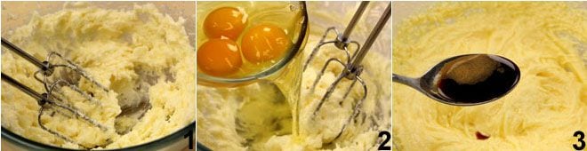 Um die Kaffee- und Mascarpone-Cupcakes auf originelle Weise zuzubereiten, habe ich mir überlegt, sie in Silikonformen in Form von Kaffeetassen zu backen, aber alternativ können Sie sie auch in den klassischen Papierförmchen backen und dann jeden Cupcake in eine Tasse stellen. Mit einem Handmixer schlagen Sie die Butter (bei Zimmertemperatur) zusammen mit dem Zucker und den Vanillemark zu einer Creme 1, dann fügen Sie die Eier (ebenfalls bei Zimmertemperatur) eines nach dem anderen hinzu, dabei immer fleißig schlagen und die Zutaten gut vermischen, bevor Sie das nächste Ei hinzufügen 2. Geben Sie auch den lauwarmen Kaffee hinzu 3.