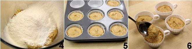Und schließlich das zuvor gemischte und gesiebte Mehl mit dem Backpulver 4. Verteilen Sie die entstandene Masse in 12 Papierförmchen, die in einem Cupcake-Backblech platziert sind 5 oder in den Silikonformen in Form von Kaffeetassen 6 und backen Sie sie bei 180° für ca. 25-30 Minuten im statischen Ofen (machen Sie vor dem Herausnehmen die Stäbchenprobe, um sicherzustellen, dass sie durchgebacken sind).