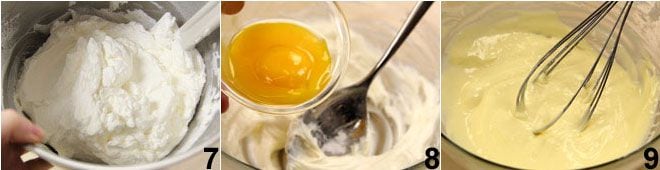 In der Zwischenzeit bereiten Sie die Mascarpone-Creme vor, indem Sie die frische Sahne mit 30 g Puderzucker aufschlagen 7. In einer anderen Schüssel schlagen Sie den Mascarpone zusammen mit den Eigelben und 30 g Puderzucker 8, dann mischen Sie die beiden Massen vorsichtig, um die Sahne nicht zu entlüften 9. Stellen Sie die Mascarpone-Sahne-Mischung im Kühlschrank in einen Behälter mit Deckel.