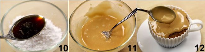 Einige Minuten bevor Sie die Cupcakes aus dem Ofen nehmen, bereiten Sie die Kaffee-Glasur vor, indem Sie in einer Schüssel 250 g Puderzucker mit dem heißen Espresso mischen 10; rühren Sie, bis eine dicke Masse entsteht 11 (wenn sie zu wenig dick ist, fügen Sie etwas Puderzucker hinzu, und im umgekehrten Fall etwas Kaffee). Sobald Sie die Cupcakes aus dem Ofen nehmen, überziehen Sie sie noch heiß mit der Glasur und lassen Sie sie abkühlen 12.
