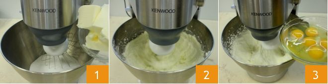 Um den Kaffeekranzkuchen zuzubereiten, beginnen Sie damit, den Kristallzucker in die Schüssel einer Küchenmaschine zu geben, fügen Sie die in Stücke geschnittene Butter bei Raumtemperatur hinzu 1. Schalten Sie die Rührbesen auf mittelhoher Geschwindigkeit ein, um die Zutaten zu vermischen, bis eine helle und schaumige Masse entsteht 2. Fügen Sie dann die Eier einzeln hinzu, während Sie die Rührbesen weiterhin laufen lassen 3.