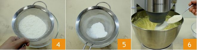 Wenn Sie alle Eier gut eingearbeitet haben und eine glatte und homogene Masse erhalten haben, reduzieren Sie die Geschwindigkeit der Rührbesen und beginnen Sie, das Mehl zu sieben 4, das Backpulver 5 zusammen in eine kleine Schüssel aufzufangen. Bringen Sie dann die Rührbesen auf die anfängliche Geschwindigkeit und geben Sie die gesiebten Pulver nach und nach mit einem Löffel hinzu 6, fügen Sie dann auch das Vanilleextrakt oder die Samen einer Schote hinzu.