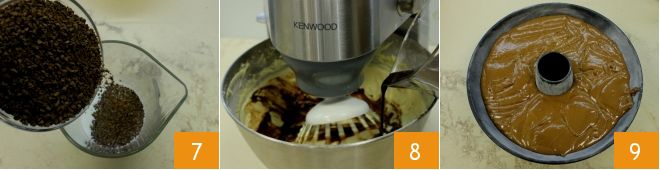 Wenn Sie die Zutaten gut eingearbeitet und vermischt haben, können Sie den löslichen Kaffee in der Milch bei Raumtemperatur oder leicht erhitzt auflösen 7. Rühren Sie mit einem Teelöffel, bis der Kaffee vollständig aufgelöst ist, und geben Sie ihn dann nach und nach zum Rest der Mischung in der Küchenmaschine 8. Vermischen Sie alles weiter, bis eine dichte und homogene Masse entsteht. Fetten und bemehlen Sie dann eine Kranzform mit einem Durchmesser von 22 cm und einer Tiefe von 10 cm und geben Sie die Mischung hinein 9, glätten Sie sie mit einem Spatel. Stellen Sie den Kuchen in einen auf 180° vorgeheizten statischen Ofen für 50 Minuten (wenn Umluftofen, bei 160° für 40-45 Minuten).
