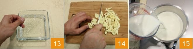 In der Zwischenzeit bereiten Sie die Creme zu: legen Sie die Gelatineblätter in einer Schüssel mit kaltem Wasser für mindestens 10 Minuten ein 13. Hacken Sie die weiße Schokolade mit einem Messer 14, dann erhitzen Sie einen kleinen Topf mit der Sahne und der Milch 15;