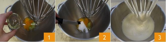 Um die Kakaorolle mit weißer Schokoladencreme zuzubereiten, beginnen Sie mit der Herstellung der Kakaobiskuitrolle. In einer Küchenmaschine mit Schneebesenaufsatz geben Sie die ganzen Eier bei Zimmertemperatur und den Honig 1. Schneiden Sie die Vanilleschote der Länge nach auf; kratzen Sie die Samen mit einem kleinen Messer heraus und fügen Sie sie zusammen mit dem Zucker zu den Eiern hinzu 2, danach schalten Sie den Schneebesen ein, bis eine helle und schaumige Masse entsteht 3. Stoppen Sie die Küchenmaschine und nehmen Sie den Schneebesen heraus.