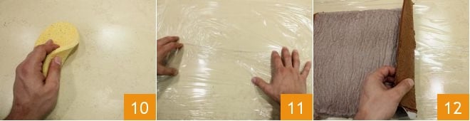Wischen Sie mit einem feuchten Tuch über die Arbeitsfläche 10, legen Sie dann zwei leicht überlappende Frischhaltefolien, die 5-6 cm länger sind als die Biskuitrolle 11; drehen Sie die Biskuitrolle um 12 und lassen Sie sie abkühlen: so wird sie nicht austrocknen.