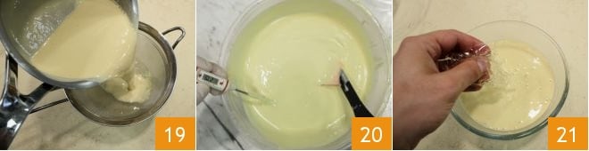 geben Sie sie durch ein feines Sieb in eine Schüssel, um eventuelle Klumpen zu entfernen 19, und prüfen Sie mit einem Küchenthermometer, ob sie eine Temperatur von 83°C erreicht hat 20. Fügen Sie die gut ausgedrückten Gelatineblätter hinzu 21 und rühren Sie mit einem Spatel, um sie vollständig aufzulösen (dieser Schritt ist wichtig, damit die Creme die richtige Konsistenz erhält).