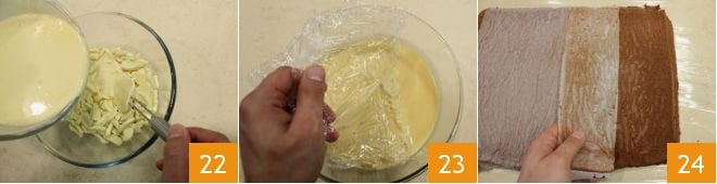 Gießen Sie die noch warme Creme über die gehackte weiße Schokolade 22 und rühren Sie, bis sie vollständig geschmolzen ist. Decken Sie sie mit der Frischhaltefolie ab und lassen Sie sie im Kühlschrank abkühlen 23. Wenn die Biskuitrolle abgekühlt ist, entfernen Sie das Backpapier 24.