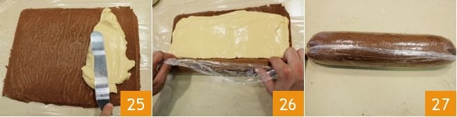 Füllen Sie die Biskuitrolle mit einer 1 cm dicken Schicht Schokoladencreme, wobei Sie etwa 1 cm vom Rand freilassen 25. Wenn Sie fertig sind, rollen Sie die Biskuitrolle mit Hilfe der Frischhaltefolie auf, beginnend mit der längeren Seite vor Ihnen 26. Während Sie rollen, denken Sie daran, die überschüssige Folie an den Rändern zu entfernen. Wenn Sie fertig sind, drehen Sie die überschüssige Folie an den Rändern 27 und halten Sie die Enden fest, ziehen Sie mit den Händen nach außen und bewegen Sie die Rolle gleichzeitig von sich weg, indem Sie sie auf der Arbeitsfläche "laufen" lassen, um sie wie ein Bonbon zu straffen. Wenn Blasen entstehen, stechen Sie die Folie mit einem Messer ein. Lassen Sie sie im Kühlschrank für mindestens 40 Minuten fest werden.