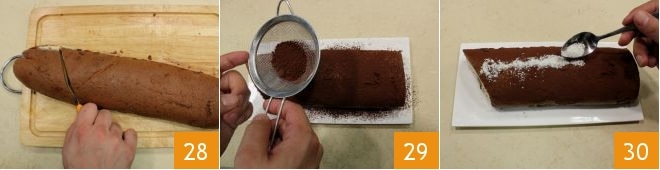 Nach dem Abkühlen schneiden Sie die beiden Enden mit einem glatten Messer ab 28 und legen Sie die Rolle auf eine Servierplatte. Bestäuben Sie sie mit Kakaopulver 29 und verteilen Sie die gehackte Milchschokolade darüber 30; schließlich servieren Sie Ihre Kakaorolle mit weißer Schokoladencreme, indem Sie sie in Scheiben schneiden.