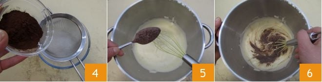 Sieben Sie das Kakaopulver in eine Schüssel 4 zusammen mit dem Mehl und fügen Sie die trockenen Zutaten nach und nach zur Ei-Zucker-Mischung hinzu 5; verrühren Sie alles gut mit den Schneebesen 6, bis ein glatter und homogener Teig entsteht.