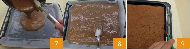 Buttern Sie ein Backblech und legen Sie es mit einem 30x40 cm großen Backpapier aus; geben Sie den Kakaoteig darauf 7, verteilen und glätten Sie ihn vorsichtig mit einem Spatel 8: es sollte eine Schicht von maximal 7 mm Dicke entstehen. Backen Sie ihn im vorgeheizten statischen Ofen bei 200°C für 8-10 Minuten (oder bei 180°C für 5-6 Minuten im Umluftofen): die Biskuitrolle sollte kurz gebacken werden, damit sie ziemlich weich bleibt. Sobald sie fertig ist, nehmen Sie sie heraus und lösen Sie vorsichtig die Ränder, die am Blech haften geblieben sind, mit einem kleinen Messer 9.