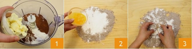 Geben Sie das gesiebte Mehl, den Kakao und schließlich die kalte Butter in Würfeln geschnitten in eine Küchenmaschine 1. Mixen Sie alles, bis Sie eine sandige und mehlige Mischung erhalten. Übertragen Sie es auf eine Arbeitsfläche und formen Sie es zu einem Springbrunnen, fügen Sie dann den Puderzucker und die geschlagenen Eigelbe hinzu 2. Kneten Sie es energisch mit den Händen 3.