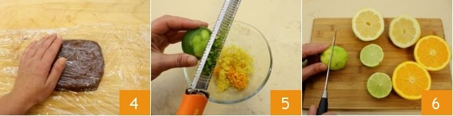Haben Sie einen ziemlich kompakten und elastischen Teig erhalten, formen Sie einen Block und wickeln Sie ihn in Frischhaltefolie 4, um ihn eine halbe Stunde im Kühlschrank ruhen zu lassen. In der Zwischenzeit bereiten Sie das Zitrusfrucht-Curd vor.