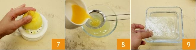 Pressen Sie alle Zitrusfrüchte aus 7 und filtern Sie dann den Saft mit einem Sieb 8. Stellen Sie es beiseite und fahren Sie mit dem Kochen des Curds fort. Legen Sie die Gelatine in kaltes Wasser, um sie weich zu machen 9.