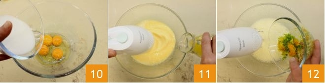 In einer großen Schüssel geben Sie die Eigelbe, die ganzen Eier und den Zucker 10 und schlagen Sie sie mit einem elektrischen Mixer, bis Sie eine helle und schaumige Mischung erhalten. Fügen Sie nun den Zitrussaft 11 und die geriebene Schale 12 nach und nach hinzu und schlagen Sie weiter, um die Zutaten gut zu vermischen.