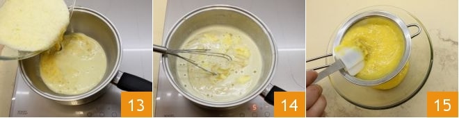 Übertragen Sie nun alles in einen kleinen Topf, um das Curd im Wasserbad zu kochen 13: Wenn Sie kein entsprechendes Utensil haben, stellen Sie die Schüssel mit der Mischung in einen Topf mit wenig Wasser, so dass der Boden nicht das Wasser berührt. Kochen Sie es bei schwacher Hitze 2-3 Minuten lang unter Rühren mit einem Schneebesen, dann fügen Sie die Butter in Stücken hinzu 14 und kochen Sie es weitere 10 Minuten, bis Sie eine dicke Creme erhalten, die Sie mit einem Sieb filtern müssen, wobei Sie einen Spatel zur Hilfe nehmen 15.