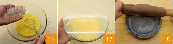 Entfernen Sie die Gelatine und drücken Sie sie gut aus, dann fügen Sie sie der Creme hinzu und lösen Sie sie auf, indem Sie sorgfältig und lange mischen 16. Wenn nötig, filtern Sie sie erneut. Decken Sie die Creme mit Frischhaltefolie ab 17 und lassen Sie sie mindestens 1 Stunde im Kühlschrank abkühlen. Inzwischen backen Sie den Boden der Tarte: Legen Sie den Kakaomürbeteig auf eine leicht bemehlte Arbeitsfläche und rollen Sie ihn mit einem Nudelholz auf eine sehr dünne Dicke von etwa 5 mm aus, dann wickeln Sie ihn um das bemehlte Nudelholz und legen Sie ihn in eine zuvor gebutterte und bemehlte 24-cm-Tortenform 18.