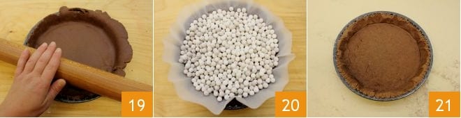 Entfernen Sie mit Hilfe des Nudelholzes den überschüssigen Teig von den Rändern 19, dann legen Sie Backpapier auf den Boden und geben Sie die entsprechenden Backkugeln darauf (wenn Sie sie nicht haben, können Sie getrocknete Hülsenfrüchte verwenden) 20. Backen Sie sie im vorgeheizten statischen Ofen bei 170°C für 40 Minuten (wenn belüftet, bei 150°C für 20 Minuten) und lassen Sie die Tarte nach dem Backen in der Form abkühlen 21.