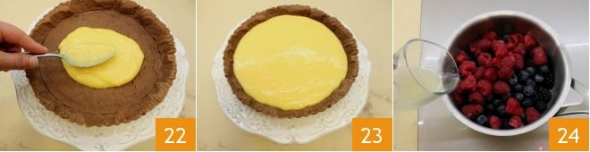 Wenn das Zitrusfrucht-Curd auch fertig ist, füllen Sie die Tarte damit 22 und füllen Sie sie bis wenige Millimeter von den Rändern und stellen Sie sie für 2 Stunden in den Kühlschrank, damit sie fest wird 23. In der Zwischenzeit können Sie die Coulis zubereiten. Weichen Sie die Gelatine in wenig kaltem Wasser ein.